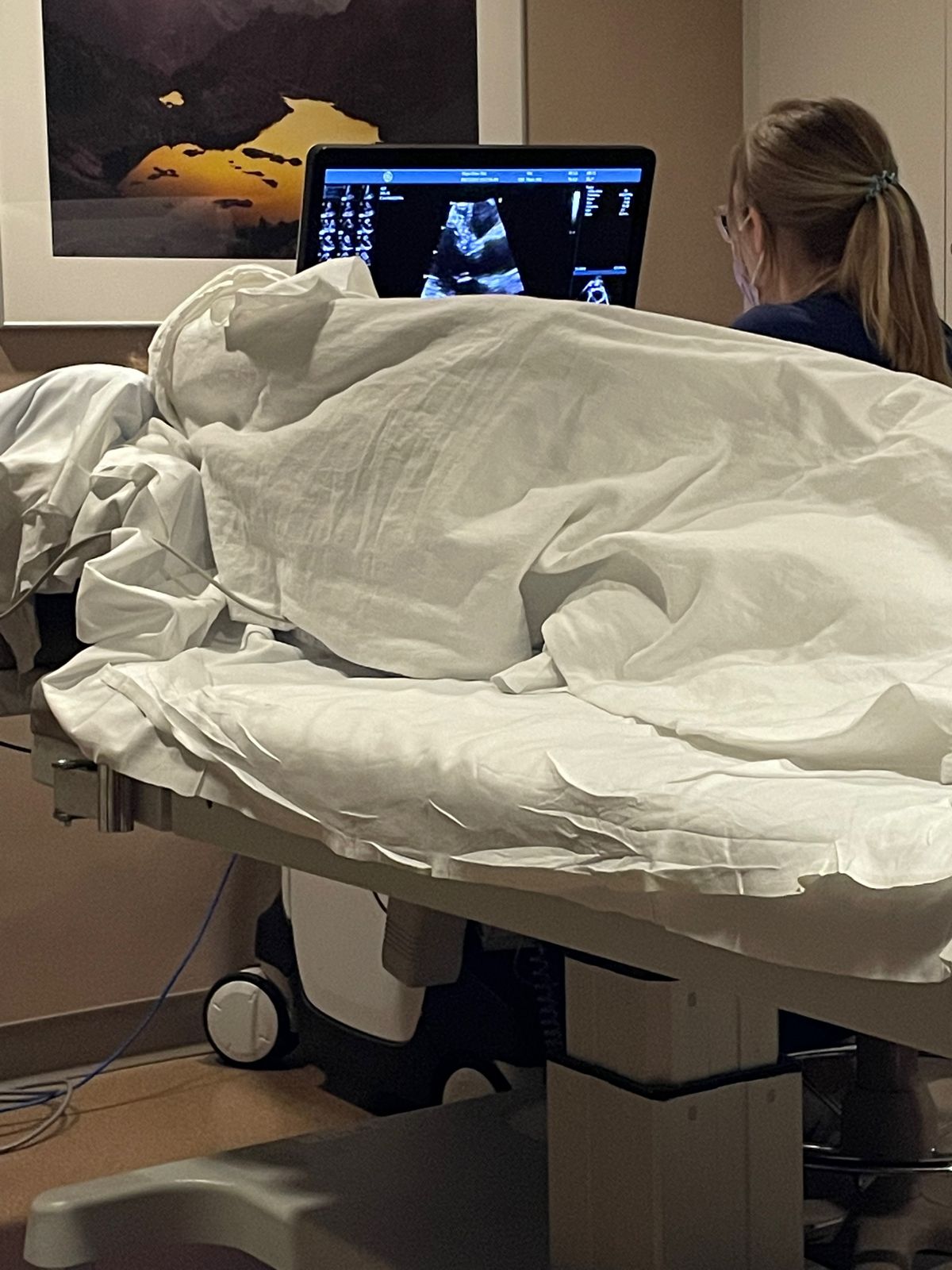 I am currently typing and sitting in on her 45 minute echocardiogram - ultrasound of her heart - where she is having her heart muscle, function, and valves checked. Her echo technologist is a pleasant young female with a very polite affect and welcoming demeanor. She acknowledged clinic recommendations to have visitors stay in lobby but kindly obliged Beth's request to have me accompany her for which I in turn thanked the technologist for letting me join.